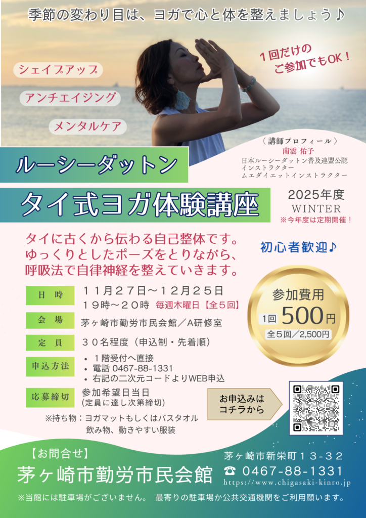 タイに古くから伝わる自己整体です。ゆっくりとしたポーズをとりながら、呼吸法で自律神経を整えていきます。シェイプアップ、アンチエイジング、メンタルケアに効果的です。