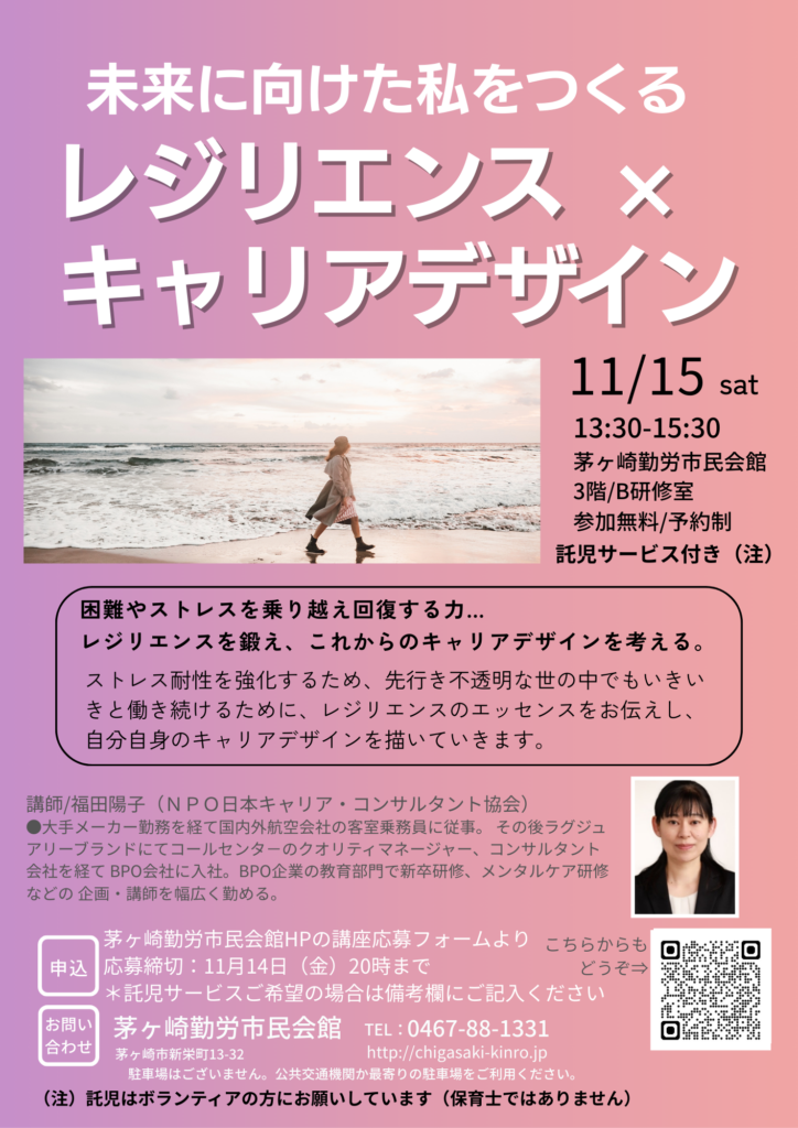 内容 | 困難やストレスを乗り越え回復する力レジリエンスを鍛え、これからのキャリアデザインを考える。 今回のセミナーは託児サービス付きです。サービス希望の方は予約フォームの備考欄に「託児サービス希望 〇歳児〇名」とご記入ください。 |