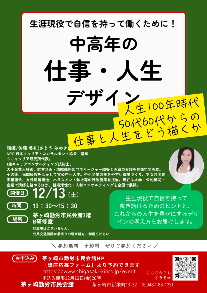 | 講座名 | 生涯現役で自信を持って働くために!『中高年の「仕事」「人生」デザイン』 |